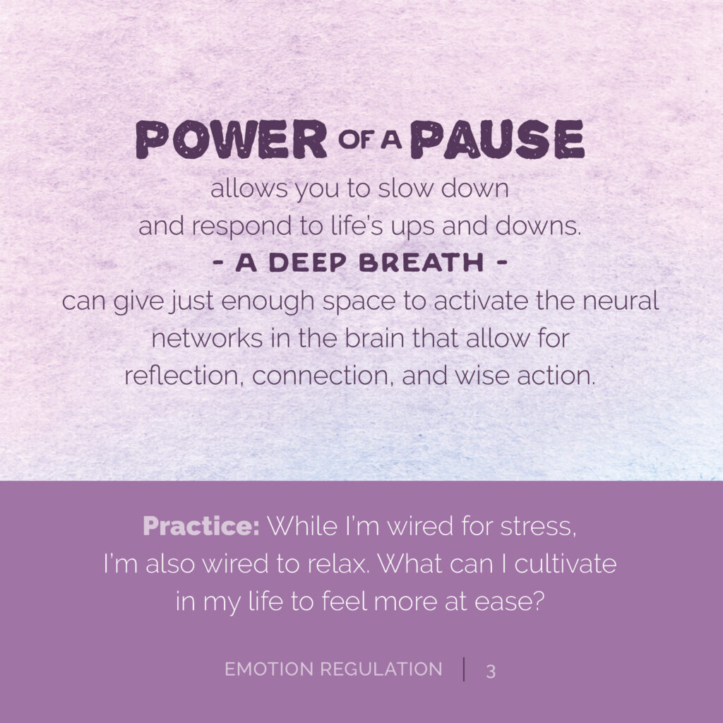 The power of a pause allows you to slow down and to respond to life’s ups and downs. A deep breath can give just enough space to activate the neural networks in the brain that allow for reflection, connection and wise action.