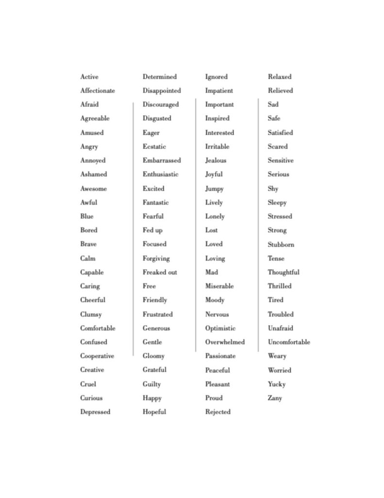 For the next week, write your feelings down. Stretch your vocabulary to capture exactly how you feel. Before bedtime, reflect on your day and identify a situation that evoked a feeling, pleasant or unpleasant. Label the feeling using this list. If there’s a subtlety that isn’t captured in this list, use sentences or combinations or invent a word. Be curious. Note any surprises or patterns that arise during the week.